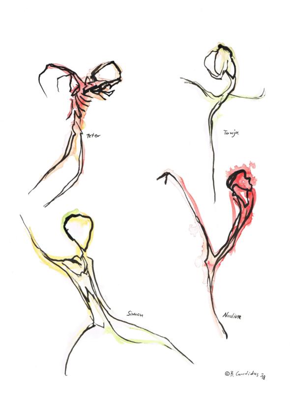 VIER TANZENDE ZUFÄLLE / Aquarell und Tusche auf Papier / 40 x 30 cm / 2018